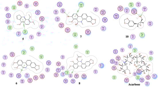 The 2D interactions of Skimmianine (5), Norchelerythrine (6), 6-Acetonyldihydrochelerythrine (7), and 6-Hydroxy-N-methyldecarine (8) alkaloids, 2,3-Epoxy-6,7-methylenedioxyconiferol (10), and the reference acarbose with α-amylase enzyme (PDB ID: 7TAA).