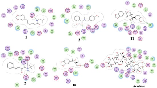 The 2D interactions of chaylbemide A (1), chalybeate B (2), and chalybemide C (3), 2,3-Epoxy-6,7-methylenedioxyconiferol (10), sesame (11), and the reference acarbose with α-glucosidase enzyme (PDB ID: 2QMJ).