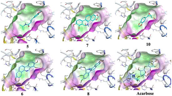 Docking conformation with the highest score conformers for Skimmianine (5), Norchelerythrine (6), 6-Acetonyldihydrochelerythrine (7), and 6-Hydroxy-N-methyldecarine (8) alkaloids, 2,3-Epoxy-6,7-methylenedioxyconiferol (10), and the reference acarbose (carbon atoms in cyan) in the binding site of α-amylase (ID: 7TAA). Lipophilic areas on the molecular surface are colored green, while hydrophilic areas are colored purple.