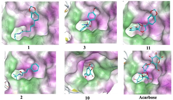 Docking conformation with the highest score conformers for chaylbemide A (1), chalybeate B (2) and chalybemide C (3), 2,3-Epoxy-6,7-methylenedioxyconiferol (10), sesame (11), and the reference acarbose (carbon atoms in cyan) in the binding site of α-glucosidase (ID: 2QMJ. Lipophilic areas on the molecular surface are colored green, while hydrophilic areas are colored purple.