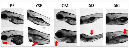 Examples of deformities and impairments observed following TCPMOH exposures. Abnormalities recorded in the zebrafish include pericardial edema (PE), yolk sac edema (YSE), cranial malformations (CM), spinal deformities (SD), and delayed/failed swim bladder inflation (SBI). Mortality is also assessed but no figure is shown. Red arrows point to the specified abnormalities.