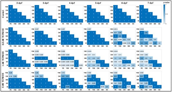 Heat maps of association for exposure groups across time. Heat maps of p-values computed from Fisher’s exact test. Association significance is computed and reported for each abnormality pair assessed during the developmental stage for each exposure group. Abnormalities include pericardial edema (PE), yolk sac edema (YSE), cranial malformations (CM), spinal deformities (SD), delayed/failed swim bladder inflation (SBI), and mortality (M).