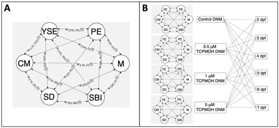 Dynamic network model (DNM) structure. The dynamic network model connecting the observed abnormalities using association links over time. Abnormalities include pericardial edema (PE), yolk sac edema (YSE), cranial malformations (CM), spinal deformities (SD), delayed/failed swim bladder inflation (SBI), and mortality (M). (A) An enlarged version of the network demonstrating the time-dependent weighted links that exist in the networks. Weighted links are assigned using the co-occurrence p-values reported in Figure 2. (B) A complete illustration of the network models for each exposure group that are configured for each time point under consideration.