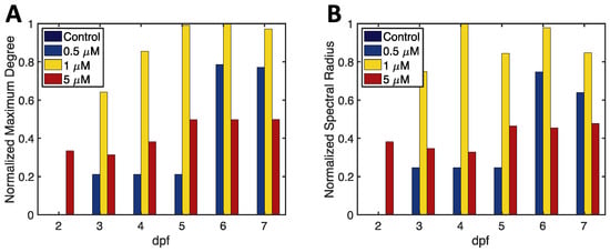 Complete network centrality scores for the dynamic network model. (A) The normalized maximum degree centrality score for all exposure groups each day post fertilization. (B) The normalized spectral radius centrality score for all exposure groups each day post fertilization. Centrality scores of zero occur for the control group at all time points and for 0.5 μM and 1 μM at 2 dpf.