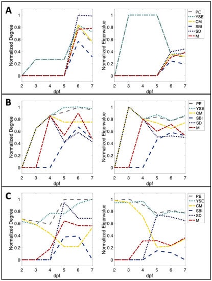 Individual node centrality scores over time. Individual node degree and eigenvector centrality scores over time for (A) 0.5 μM TCPMOH, (B) 1 μM TCPMOH, and (C) 5 μM TCPMOH. The degree and eigenvector centrality scores are computed for each node in the dynamic network model. Nodes represent abnormalities assessed: pericardial edema (PE), yolk sac edema (YSE), cranial malformations (CM), spinal deformities (SD), delayed/failed swim bladder inflation (SBI), and mortality (M). The control group is omitted as centrality scores are zero for each node across all time points.