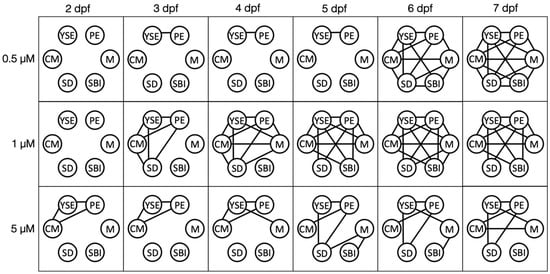 The role of pericardial and yolk sac edema is especially apparent in the 0.5 μM group. The 0.5 μM group presents with the co-occurrence of pericardial and yolk sac edema at early points: 3, 4, and 5 dpf. At 6 dpf, there is a striking increase of co-occurrence in abnormalities jumping from one network link at 5 dpf to 11 at 6 dpf. Interestingly, the critical node, or abnormality co-occurring at the highest rate to other abnormalities, is spinal deformity at 6 and 7 dpf, while the critical nodes at 3, 4, and 5 dpf are jointly pericardial and yolk sac edema. The change in critical node is due to the co-occurrence of spinal deformity and mortality at 6 dpf. The early presence and co-occurrence of pericardial and yolk sac edema may be causing incidences of further deformities, as both abnormalities continue to co-occur with one another and the incidence of remaining abnormalities is at a high rate.