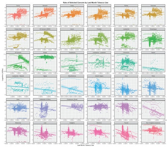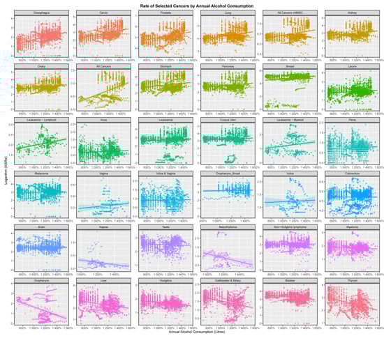 Figure 1 shows the relationship of many cancers to tobacco exposure. The figure clearly shows that fifteen cancers are identified as being linked with tobacco exposure, all of which have previously been identified in epidemiological studies []. All cancers, ACnNMSC, lung cancer, larynx, cervical, oesophageal and cervical cancer are shown to be tobacco-related. This finding confirms this methodology as a way to look at cancer incidence from the real-world epidemiological data when controlled studies of risk exposure would not be possible.