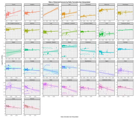 Rates of selected cancers by daily cannabis use interpolated.