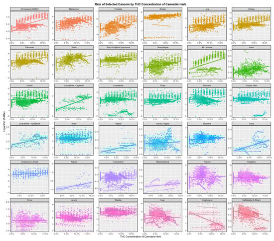 Rates of selected cancers by THC concentration of cannabis herb.