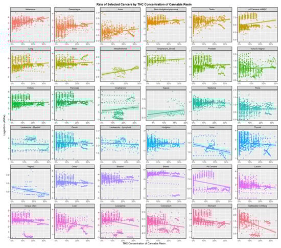 Rates of selected cancers by THC concentration of cannabis resin.