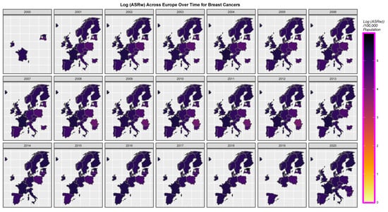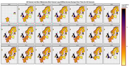 Cancer data were taken from the Cancer in Five Continents (CI5) dataset publicly available from the International Association for Research on Cancer (IARC) and the European Cancer Information Systems (ECIS) website [,]. Data for 26 cancers were provided directly from ECIS and the included age-standardised rates (ASRs) calculated for the world-standardised population for 1973 (ASRw) [,,]. The cancers for which ASRw rates were provided directly from ECIS were: all cancers (excluding non-melanoma skin cancer), anus, bladder, brain and central nervous system, female breast, cervix and corpus uteri, colorectum, gall bladder, Hodgkin lymphoma, kidney, larynx, liver, lung, melanoma of skin, multiple myeloma, non-Hodgkin’s lymphoma, oesophagus, vulva and vagina combined, ovary, pancreas, penis, prostate, stomach, testis and thyroid.