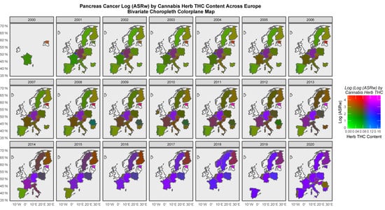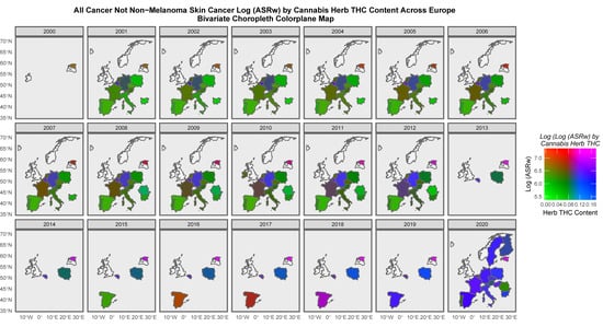 The present study was based on the hypothesis that the oncogenic effects of cannabinoids identified in vitro would extend beyond testicular cancer to an undetermined number of other tumour types. This paper therefore sought to study in overview the association between community cannabinoid exposure and clinical cancer incidence across Europe for forty different cancer types in recent decades in bivariate and multivariate frameworks, to determine effect sizes and public health impacts, to ascertain the potentially causal effect of these associations by the quantitative techniques of formal causal inference and to compare population health findings in Europe with those from North America [,,]. Given the high density of cannabinoid receptors in the reproductive tracts, the myriad important functions of cannabinoids in these tissues in both sexes and the importance of potentially inheritable genotoxic effects [,] and the above-cited findings relating to reproductive tumourigenicity were a particular focus of interest. Based on the findings of a similar analysis of trends in the USA, we hypothesised that cannabis would be positively associated with eight cancers—breast, liver, thyroid, pancreas, oropharynx, kidney, melanoma and acute myeloid leukemia—amongst others [].