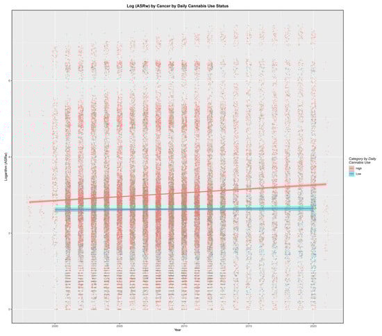 Cannabis has also been shown to be an important factor leading to hepatic cirrhosis [,,] and is recognised as being involved in hepatocarcinogenesis, particularly in the context of cocarcinogens such as chronic hepatitis B and C infection []. Cannabis has also been shown to be powerfully pro-oncogenic by multiple cellular, vascular and immune mechanisms in the liver and that its pro-oncogenic effects occur three orders of magnitude (over 1000-fold) lower than those of its anti-oncogenic effects []. Epidemiologically this is important as the rise in hepatocarcinogenesis in many places is widely attributed to altered ethnic patterns and viral infection rates [] with the impact of increasing cannabinoid exposure typically overlooked.