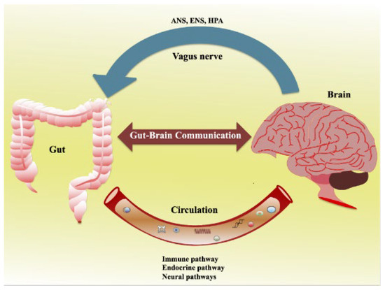Schematic diagram showing the bidirectional communication between the gut and the brain. (Reprinted with permission from Ref. [32]. Copyright 2008 published by MDPI).