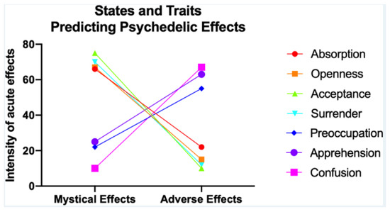- Aday, J.S.; Davis, A.K.; Mitzkovitz, C.M.; Bloesch, E.K.; Davoli, C.C. Predicting Reactions to Psychedelic Drugs: A Systematic Review of States and Traits Related to Acute Drug Effects. ACS Pharmacol. Transl. Sci. 2021, 4, 424–435. [Google Scholar] [CrossRef] [PubMed]