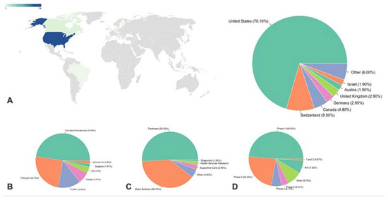 Overview of Clinical Trials: Nationality, Analyzed Psychedelic Drugs, Trial Type, and Current Stages. (A) Clinical trials by nationality. (B) Psychedelic drugs under analysis in each trial. (C) Type of clinical trial. (D) Stage of currently reported clinical trials underway. (Reprinted with permission from Ref. [72] Copyright published by Springer Nature).