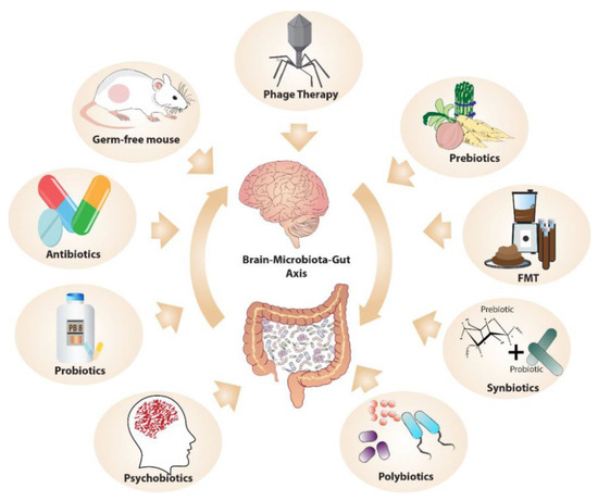 - Suganya, K.; Koo, B. Gut–Brain Axis: Role of Gut Microbiota on Neurological Disorders and How Probiotics/Prebiotics Beneficially Modulate Microbial and Immune Pathways to Improve Brain Functions. Int. J. Mol. Sci. 2020, 21, 7551. [Google Scholar] [CrossRef] [PubMed]