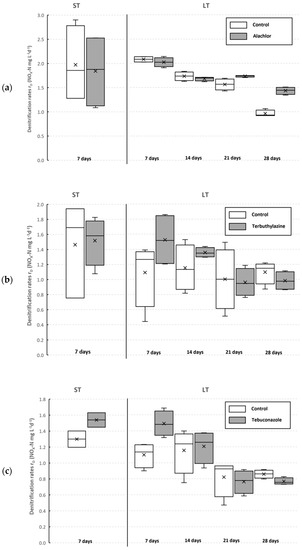 The selected pesticides (TEB, TER, ALA) were tested using both seven-day batch denitrification assays (“short test”, ST) and 28-day semi-continuous denitrification assays (“long test”, LT). Laboratory tests were performed in the same way as in Pániková et al. [20].