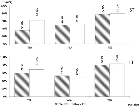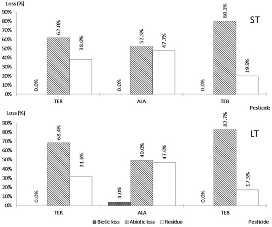 The methodology used assumes that the dissipation of the pesticides will be comparable or lower in treatment 2, with the addition of the HgCl2 inhibitor, than in treatment 1, where only the pesticide is present, i.e., both biotic and abiotic losses can occur. This was the case for ALA and TEB, for which, at the end of both ST and LT tests, the losses were comparable (Figure 3). However, in the case of TER in ST, the loss for treatment 1 (35.8%) was only half that of treatment 2 (62.0%), although the difference was lower after 28 days (Figure 3). Since the only major difference between treatment 1 and 2 was the content of HgCl2, these results suggest that immediate adsorption was probably influenced by this compound. The results of abiotic loss regarding this pesticide, therefore, cannot be taken into consideration. This behavior has not been observed before and should be analyzed in more detail in further studies.