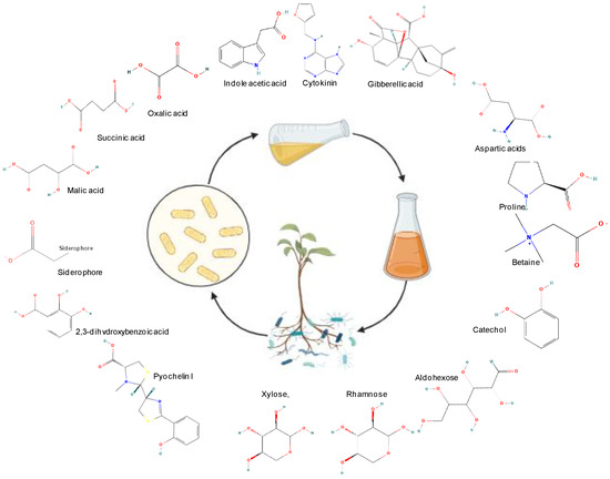 Microbes release a variety of exudates into the rhizosphere, where the term “exudates” refers to compounds released through exudation, secretion, or both. These compounds are diverse, with the majority being organic, inorganic, or chemical in nature. They include metabolites like hormones, organic acids, amino acids, exopolysaccharides, siderophores, hydrogen cyanide (HCN), and volatile organic compounds(VOCs) (Figure 1). Microbes produce these compounds in response to various stimuli, such as competition for niche species, nutrient deficiency, signals from plants, or as a response to environmental stress. Research indicates that, during the evolutionary phase, plants have developed sensing mechanisms to perceive a fraction of these compounds [14] to enhance their growth under adverse conditions [15,16,17].
