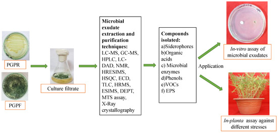 Isolation, purification, and characterization of microbial exudate and its application. Pure culture of microbes, viz., plant-growth-promoting rhizobacteria (PGPRs) and plant-growth-promoting fungi (PGPFs) were grown in suitable liquid culture media. Then, the cell-free microbial culture filtrates can be characterized by advanced techniques like liquid chromatography–mass spectrometry (LC-MS), gas chromatography–mass spectrometry (GC-MS), high-performance liquid chromatography (HPLC), liquid chromatography–diode array detection (LC-DAD), nuclear magnetic resonance(NMR) spectroscopy, high-resolution electrospray ionization mass spectrometry (HR-ESI-MS), heteronuclear single quantum coherence (HSQC) spectroscopy, electronic circular dichroism (ECD), thin layer chromatography (TLC), high-resolution mass spectrometry (HRMS), electrospary ionization mass spectrometry (ESI-MS), distortionless enhancement by polarization transfer (DEPT), MTS assay, X-ray crystallography, etc. The culture filtrates containing siderophores, organic acids, microbial enzymes, phenols, VOCs, EPS, etc. were isolated, identified, and further tested through in vitro and in planta assay.