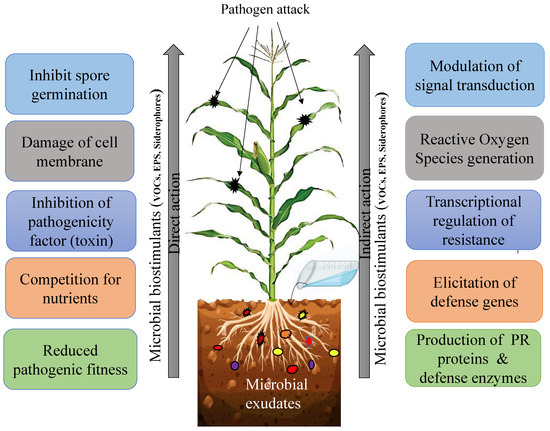 Induction of biotic stress tolerance through microbial exudates. Application of microbial biostimulants, viz., exopolysaccharides, siderophores, and volatile compounds directly and indirectly protect the plants from diverse pest and pathogen attack. Directly, they hamper the activity of the pathogen through restricted spore germination, damage of cell membrane, inhibition of pathogenicity factors, competition for nutrients, and reduced pathogenic fitness that, in turn, affect the pathogenicity and survivability of pathogens. Microbial biostimulants can induce the plant defense system through modulation of signal transduction pathways, generation of reactive oxygen species (ROS), transcriptional regulation of resistant genes, elicitation of PR protein synthesis, as well as production of secondary metabolites, etc.; thus, providing overall protection for the plant.