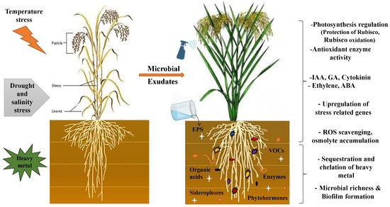 In addition to promoting plant health, microbial exudates induce or stimulate the plant defense system against diverse biotic and abiotic stresses through modifications in physiological, biochemical, and biological properties (Table 3).