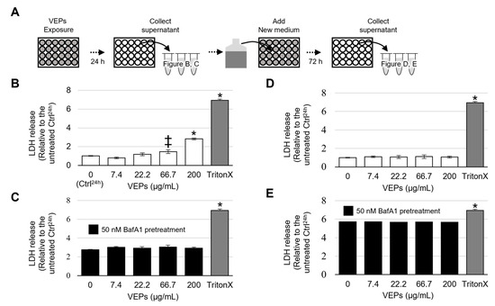Effect of VEPs’ accumulation and deacidification by BafA1 on VEPs’ cytotoxicity. Collection of culture supernatants and treatment of VEPs for use in the LDH assay (A). LDH assay result calculation of relative 0 µg/mL of VEPs for 24 h (Ctrl24). A cell lysate permeabilized with Triton X was used as a positive control. In this analysis, we evaluated the effects of VEPs treatment for 24 h (B,C) and after the next 72 h (D,E), as well as the effects of VEPs on lysosomal deacidification by BafA1 (C,E). * p < 0.001 vs. Ctrl24h; ‡ p < 0.05 vs. Ctrl24h.