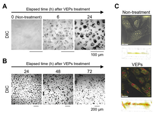 Time required for the intracellular ingestion of VEPs. To determine how long it takes for VEPs to be ingested into cells, the cells were imaged on a confocal laser scanning microscope (FLUOVIEW FV3000) at 6 h and 24 h after VEPs treatment (A). To determine how long the VEPs remained in the cells, the VEPs were treated for 24 h and the cells were imaged after the next 24, 48, and 72 h (B). To clarify the intracellular localization of VEPs, the VEPs were treated for 3 h and the cells were digitally dyed in yellow and red, respectively, and imaged (C).