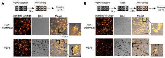 We performed an AO staining procedure to determine whether the acidic pH in lysosomes was maintained in the cells that accumulated VEPs. AO is a double-fluorescent dye that binds to nucleic acids and enters acidic sites, such as lysosomes, and has different maximum excitation and emission wavelengths (Ex/Em max). The Ex/Em max of AO in lysosomes is 460 nm/650 nm, and the fluorescence intensity indicates that the acidic environment of lysosomes is maintained. In BEAS-2B cells 48 h after seeding on a slide glass, strong AO fluorescence was observed in the cytoplasmic region (Figure 4A,B). After 24 h VEPs treatment, the fluorescence image of AO was similar to that of the non-treatment at first glance, but when the area with strong AO fluorescence was enlarged, vesicles similar to blebbing were observed, and the AO fluorescence in the cytoplasm was weak (Figure 4A,B). In BEAS-2B cells 120 h after seeding on a slide glass, the AO fluorescence in the cytoplasm was weaker than in the non-treatment (Figure 4A), and the AO fluorescence from vesicles was similar to that of the 24 h VEPs treatment cells (Figure 4A,C). After culturing for 72 h with accumulated VEPs, the AO fluorescence in the cytoplasm was greatly reduced (Figure 4B).