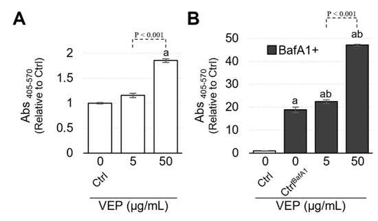 The lysosomal enzyme β-HEX is widely used as an indicator of extracellular vesicle secretion via lysosomes. Lysosome-mediated pathways are known to be one of the origins of exocytosis, thought to be due to proton release within lysosomes [17]. Cell culture supernatants treated with VEPs for 24 h were collected and measured for B-HEX activity, which was significantly increased at 50 µg/mL (Figure 5A). Treatment with BafA1 significantly increased the β-HEX activity regardless of VEPs treatment (Figure 5B). Co-treatment with VEPs and BafA1 significantly increased β-HEX activity even at 5 µg/mL, and increased it further at 50 µg/mL VEPs (Figure 5B).