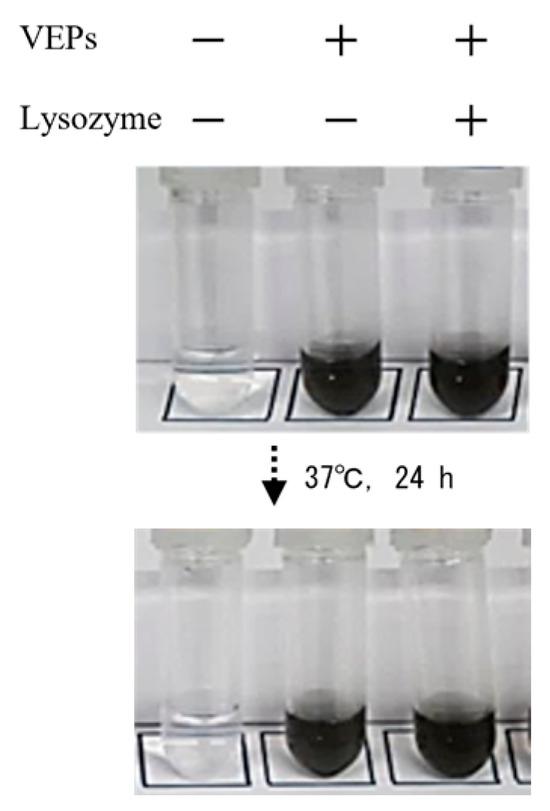 Form of VEPs in lysozyme solution. To clarify the solubility of VEPs with enzymatic treatment, VEPs were suspended in 100 µg/mL human lysozyme (Sigma-Aldrich, Tokyo, Japan) solution in 10 mM citrate buffer (pH 5.0) and incubated at 37 °C. After 24 h, the VEPs were resuspended by vertexing and photographed and imaged with a DLSR camera.