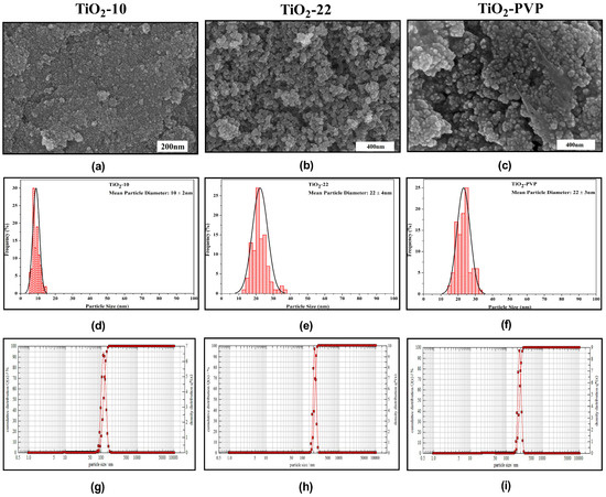 The absorbance spectrum shows an absorption edge between 270 nm and 320 nm (Figure 3a), which may have been caused by the electron’s photo-excitation while moving from the valence to the conduction band. Many variables may influence a NP’s absorbance, including band gap, oxygen deficiency, and impurity centers. A recent theoretical paradigm by Burello and Worth suggested that the relationship between the cellular redox potential and the metal oxide band gap may shed light on why some substances result in oxidative stress and toxicity [39]. The optical band gap Eg value was obtained from the extrapolation of the linear area of a plot of (αhν)2 and energy. The band gap, as measured from the Tauc plot, was found to be 3.07 eV, 2.88 eV, and 2.82 eV for TiO2-10, TiO2-22, and TiO2-PVP, respectively (Figure 3b). This rise in band gap value confirms the difference in the particle size. Additionally, a greater band gap value denotes that the TiO2 NPs are more capable of photo-oxidation and photo-reduction.