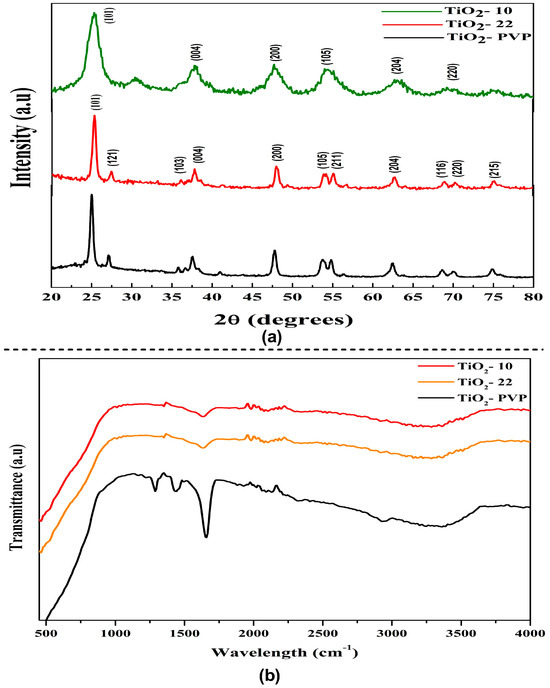 The diffraction peak of the synthesized NPs can be attributed to characteristics peaks that can be attributed to the anatase phase (JCPDS-ICDD card: 21-1272) (Figure 2a). The intense peak diffraction peaks at 25.28, 37.81, 47.99, 53.95, 55, 62.9, 70, and 75 corresponded to the 101, 004, 200, 105, 211, 204, 220, and 215 orientations, respectively. The full width at half maximum (FWHM) of the hkl peaks was determined using the Debye–Scherrer relation to determine the average crystallite size. The estimated crystallite size via XRD was 8 nm, 18 nm, and 20 nm for TiO2-10, TiO2-22, and TiO2-PVP, respectively. The XRD pattern of PVP coated TiO2-PVP NPs can be compared with the standard XRD pattern of pure PVP powder (Figure S1). The variance in grain/crystallite was determined to be in good agreement with the FE-SEM results.