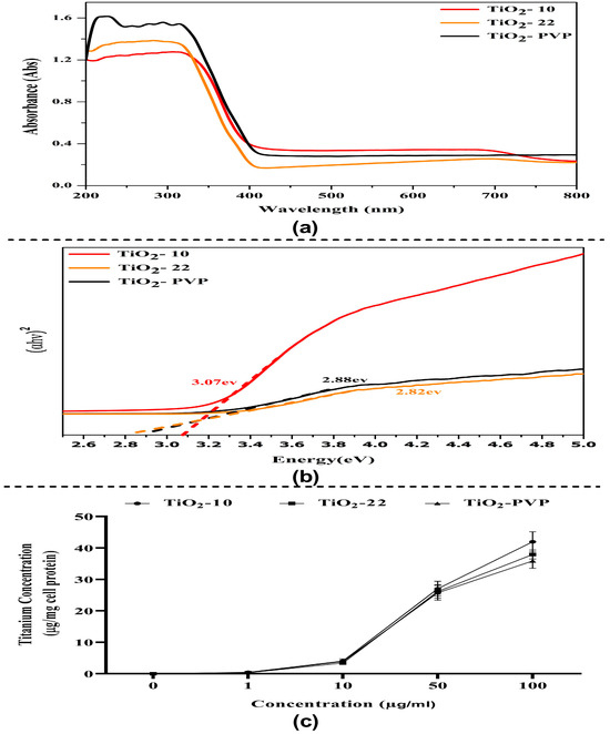 Optical properties and intracellular uptake of TiO2 NPs. (a) UV–visible absorption spectrum of TiO2 NPs in the 200–800 nm range. (b) Tauc plot graph for optical energy band gap determination. (c) Evaluation of intracellular uptake via total Ti ion quantification via flame atomic absorption spectroscopy.