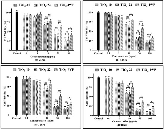 Cell viability assessment via the MTT assay. Viability percentages relative to control cells under the different time points of (a) 24 h, (b) 48 h, (c) 72 h, and (d) 96 h. Data are shown as the mean ± SEM (n = 3). * p < 0.05, ** p < 0.01, *** p < 0.001, and ns: not significant.