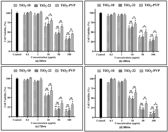For TiO2-10, after 24 h of exposure, cellular viability was reduced to below 75% at 10 µg/mL (p < 0.05), which further declined slowly with time to 58% (p < 0.05) at the end of 96 h. However, at 50 µg/mL, a statistically significant decline was observed at the end of 24 h (42%, p < 0.05), which further decreased to 12% (p < 0.01) at 96 h. At 100 µg/mL, the cell viability was at 24% (p < 0.01) after 24 h and declined to 6% (p < 0.01) after 96 h. The results were similar for the TiO2-22 NPs, irrespective of the exposure duration compared to the negative control. When the results of both forms of NPs were compared, no statistically significant differences were observed for any concentration and time point. The effect induced via the PVP coating was evident when the outcomes of TiO2-22 were paralleled with the coated counterpart (TiO2-PVP). The cellular viability at concentrations ≥ 10 µg/mL for TiO2-PVP NPs had a significantly lower cytotoxic effect than uncoated TiO2-22 NPs of the same size for concentrations ≥ 10 μg/mL at all time points. The IC50 was calculated to be 20.57 μg/mL, 18.14 μg/mL, and 28.37 μg/mL after 96 h for TiO2-10, TiO2-22, and TiO2-PVP, respectively.