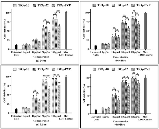Cell viability assessment via the LDH assay. Viability percentages compared to control cells under the different time intervals of (a) 24 h, (b) 48 h, (c) 72 h, and (d) 96 h. Data are shown as the mean ± SEM (n = 3). * p < 0.05, ** p < 0.01, *** p < 0.001 and ns: not significant.