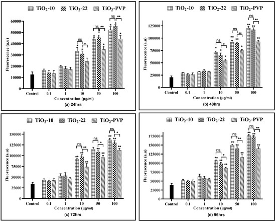 Similar to that of the cell viability assays, at lower concentrations and shorter exposure durations (24 h and 48 h), a significant difference was not observed in the effects produced through all the NPs (Figure 8). At concentrations ≥ 10 µg/mL and extended durations, there was a significant elevation in ROS generation in PC-12 cells post-exposure to TiO2 NPs. The ROS levels increased by a minimum of 2.5-fold at 24 h for 10 μg/mL and a maximum by 4.5-fold for 100 μg/mL at 96 h for both the TiO2-10 and TiO2-22 NPs. However, no significant differences were observed for an increase in ROS at the same concentrations and at any time points for both types of NPs. The comparative analysis of the coated and non-coated NPs suggested a statistically significant difference in the level of ROS, with TiO2-PVP generating lower levels of ROS compared to the non-coated TiO2-22 NPs.