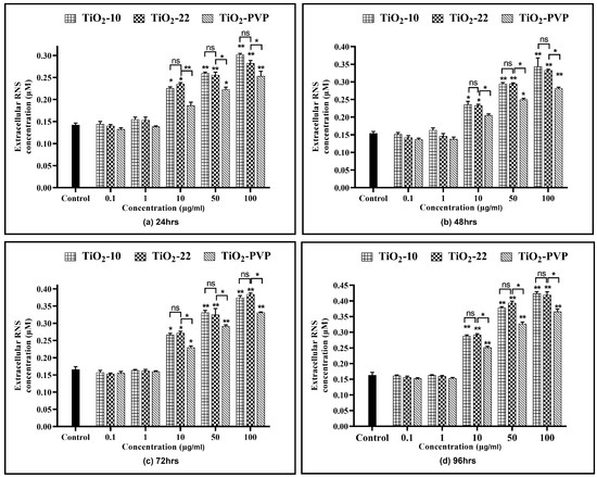 All three NPs showed a time- and concentration-dependent rise in the RNS levels (Figure 9), except at 0.1 µg/mL and 1 µg/mL. TiO2-10 NP exposure indicated a significant 1.52-fold (p < 0.05) elevation in RNS levels at all exposure durations for 10 µg/mL compared to the negative control. At 100 µg/mL, there was a significant 2-fold increase in RNS levels at all four time points compared to the negative control. Similar results were also obtained with the TiO2-22 NPs. A comparative analysis for the effect of size on RNS levels suggested no significant difference in the levels of RNS when compared to the smaller TiO2-10 NPs.
