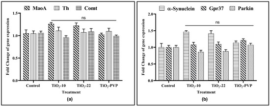 Gene expression analysis upon exposure to TiO2 NPs. (a) Gene expression changes of MaoA, Th, and Comt. (b) Gene expression changes of α-synuclein, Gpr37, and parkin. Data are shown as the mean ± SEM (n = 3) with reference to the control. ns: not significant.