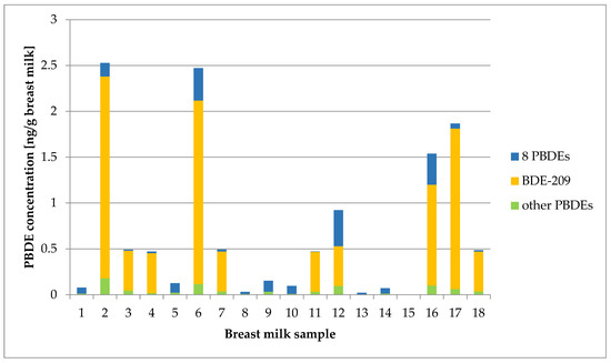 Distribution levels of BDE-209, the sum of eight PBDEs and other PBDEs in breast milk samples of 18 Austrian mothers. Eight PBDEs: Σ of BDE-28, BDE-47, BDE-66, BDE-85, BDE-99, BDE-100, BDE-153 and BDE-154. Other PBDEs: Σ of BDE-49, BDE-77, BDE-118, BDE-126, BDE-139, BDE-181, BDE-183, BDE-196, BDE-197, BDE-203 and BDE-207.