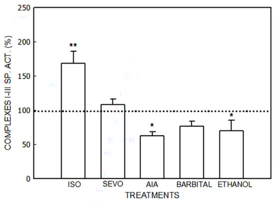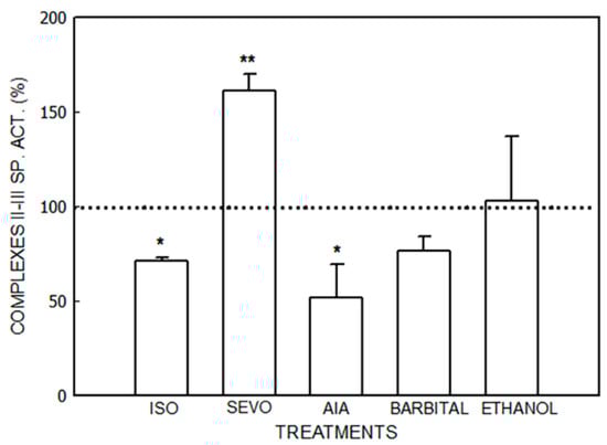 Activity of succinate-cytochrome C reductase (Complexes II–III) after administration of isoflurane (ISO), sevoflurane (SEVO), allylisopropylacetamide (AIA), barbital and ethanol to mice. Data represent mean value ± S.D. of 4–6 animals and are expressed as a percentage considering the daily control group as 100% (dotted line). * p < 0.05, ** p < 0.01: significance of differences between the treated and control groups. A single control value is given because no significant differences were obtained in any of the controls after the administration of the vehicle. Control value (nmol/mg): 16.3 ± 5.9. Other experimental details are described in the legend of Figure 1 and in the Section 2.