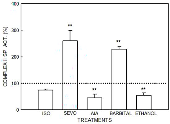 Activity of succinate dehydrogenase (Complex II) after administration of isoflurane (ISO), sevoflurane (SEVO), allylisopropylacetamide (AIA), barbital and ethanol to mice. Data represent mean value ± S.D. of 4–6 animals and are expressed as a percentage considering the daily control group as 100% (dotted line). ** p < 0.01: significance of differences between the treated and control groups. A single control value is given because no significant differences were obtained in any of the controls after the administration of the vehicle. Control value (nmol/mg): 70.7 ± 13.0. Other experimental details are described in the legend of Figure 1 and in the Section 2.