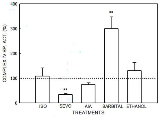 Cytochrome c oxidase (Complex IV) activity (Figure 4) was increased by 200% by barbital (p < 0.01) and decreased by 77% by sevoflurane (p < 0.01). No variations were observed in the animals that received isoflurane, AIA, or ethanol.