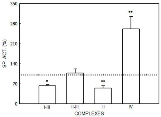 The activities of NADH-cytochrome c reductase (Complexes I–III) and succinate-cytochrome c reductase (Complexes II–III) were determined using NADH or succinate as substrates, respectively, following the reduction of cytochrome c3+ [] at 550 nm (ε = 19.6 mM−1·cm−1) for 2 min at 37 °C. The incubation system to determine Complexes I–III contained: 0.1 M potassium phosphate buffer pH 7.4, 0.2 mM NADH, 0.5 mM KCN, cytochrome c+3 25 µM, and mitochondrial fraction (0.02 mg/mL protein), in a final volume of 1 mL. A blank reaction without enzyme was included. When Complexes II–III were measured, the incubation system was the same, but 5 mM succinate was added instead of NADH. One enzyme unit (U) was defined as the amount of enzyme that catalyzes the synthesis of 1 nmol of reduced cytochrome c per minute under standard incubation conditions.