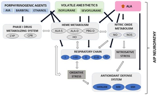 In CF1 mice brains, we have demonstrated that the administration of volatile anesthetics and other known porphyrinogenic drugs leads to alterations in the cholinergic and glutamatergic system [,], the antioxidant defense system [], the phase I drug metabolizing system [,], and the synthesis of nitric oxide (NO) []. In addition, previous studies have shown that ALA administration to CF1 mice also causes alterations in numerous metabolic pathways in the brain of mice [].
