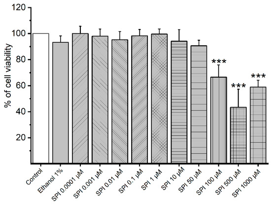 To investigate cell viability of A7r5 cells under the effect of SPI, MTT assay was used. Figure 1 presents the % effects of different SPI concentrations in the cell viability. The results show that the three highest SPI concentrations (100, 500, and 1000 μmol/L) significantly reduced cell viability (67%, 43%, and 59%, respectively).