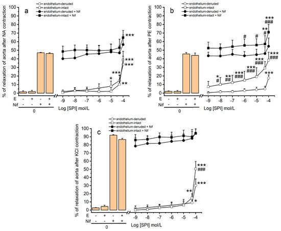 Vasorelaxant effects induced by Nif (nifedipine, 1 and 0.01 µmol/L) plus SPI (spironolactone, 0.001–100 μmol/L) on endothelium (E)-intact and -denuded aorta rings pre-contracted with (a) NA (noradrenaline, 1 μmol/L, n = 16), (b) PE (phenylephrine, 1 μmol/L, n = 10), and (c) KCl (potassium chloride, 60 mmol/L, n = 10). Data are presented as a percentage (%) of relaxation on maximal contraction induced by vasoactive agents. Each bar (left panel) or point (right panel) represents mean values and vertical lines the S.D. of the mean. * (asterisk) represents differences versus control (* p < 0.05, ** p < 0.01, and *** p < 0.001), and # (cardinal) shows significant differences between endothelium-denuded versus endothelium-intact (# p < 0.05, ## p < 0.01, and ### p < 0.001) (p < 0.05, two-way ANOVA with interaction followed by Bonferroni’s post hoc t-tests).