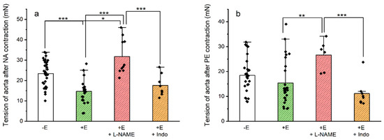 Maximum tensions produced by (a) NA (noradrenaline, 1 μmol/L, n = 28) and (b) PE (phenylephrine, 1 μmol/L, n = 24) on endothelium-denuded and -intact rings and in the presence of the inhibitors L-NAME (N(ω)-nitro-L-arginine methyl ester, an eNOS inhibitor, 100 µmol/L) and Indo (indomethacin, a non-selective COX inhibitor, 10 µmol/L). The values are expressed as tension (mean) ± S.D. (mN). Dispersion points represent each value. * (asterisk) represent statistical differences between conditions tested (* p < 0.05, ** p < 0.01, and *** p < 0.001); two-way ANOVA followed by Bonferroni’s t-tests).